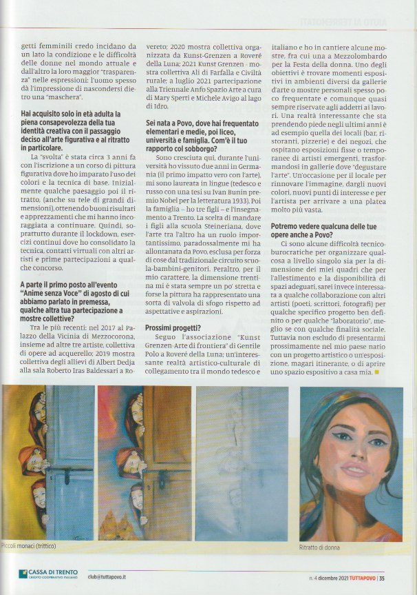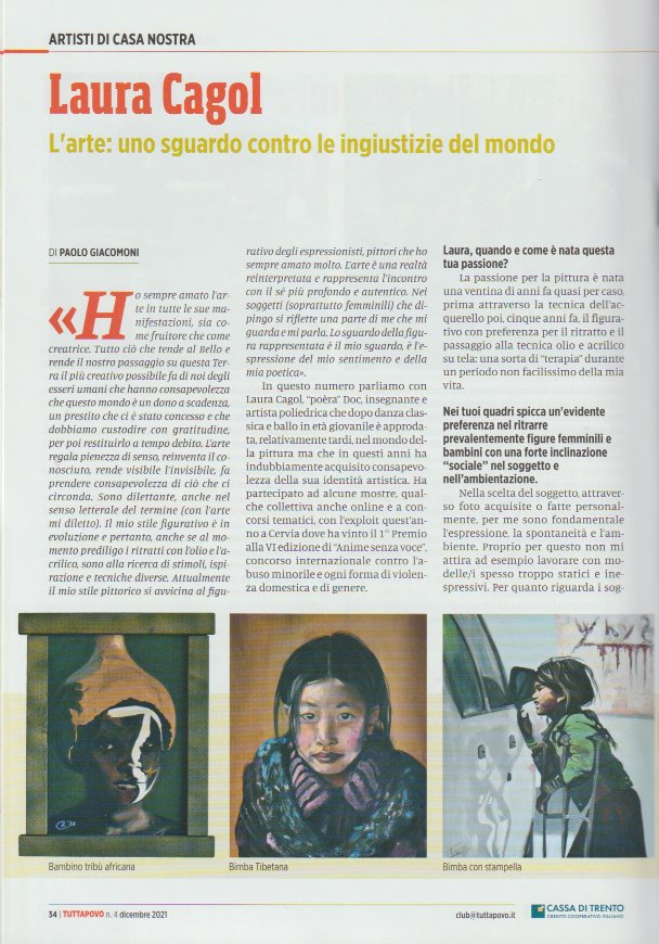 “I don’t particularly draw inspiration from specific artists when I paint; but I’ve always adored expressionist art, the painters of the ‘Blaue Reiter’, the Fauves, Gauguin, and so I am probably influenced by them. When I paint with watercolors, it is the impressionist painters like Monet or Cézanne who accompany my brushstrokes. Currently, alongside figurative portraiture, I am exploring abstract and a more textured technique, but I still feel it is somewhat distant from my artistic project. In the portraits I paint, I am captivated by the gazes and cannot help but fall in love with the subjects I am painting. I let them go with difficulty, as if I have to cut an umbilical cord each time. The creative act is a suspension from the daily struggle for survival. For me, it is a meditative, spiritual act. It is that prayer I do not express in words. Or even better: it is pure gratitude!”Laura is born and raised in the hills of Trento, “with the horizon of the mountains in the eyes and the pale blue of their profile in the heart”.