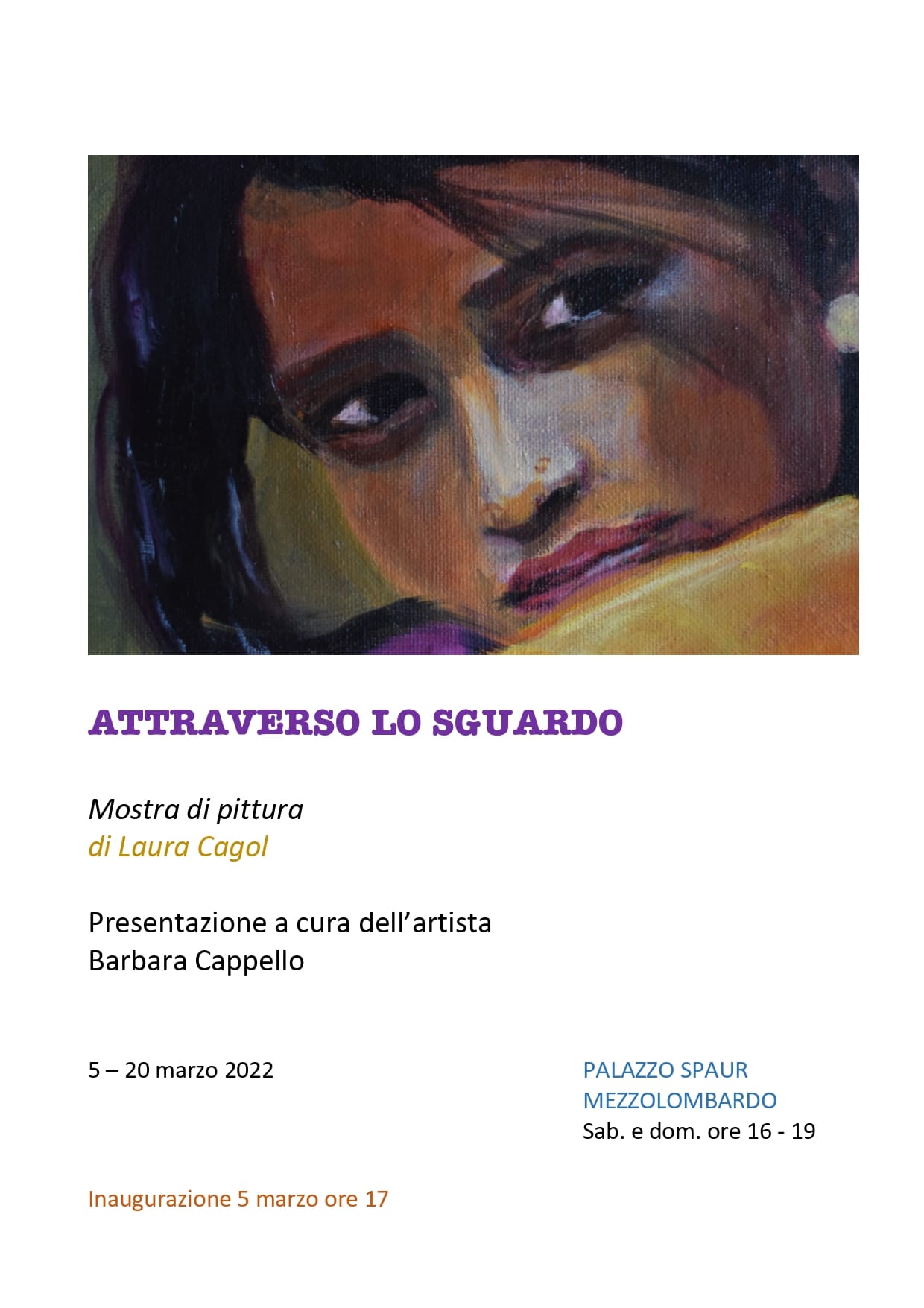 - prima mostra personale (dopo due anni di chiusura a causa del Covid) dal titolo “Attraverso lo sguardo” a Palazzo Spaur a Mezzolombardo, con presentazione al Vernissage a cura dell’artista Barbara Cappello;
