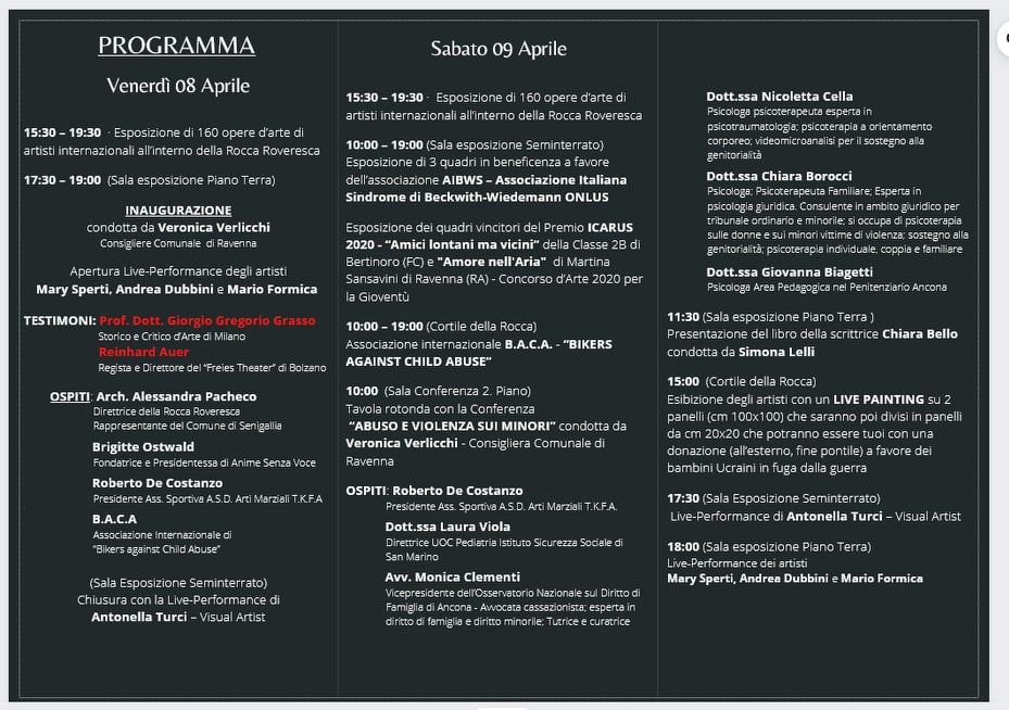 - partecipazione all’evento Internazionale d’Arte contemporanea contro l’abuso minorile, a cura dell’Associazione Anime Senza Voce a Cervia, Cattolica e Milano Marittima. Vincitrice del 1° premio con la tela “Povertà e abuso”